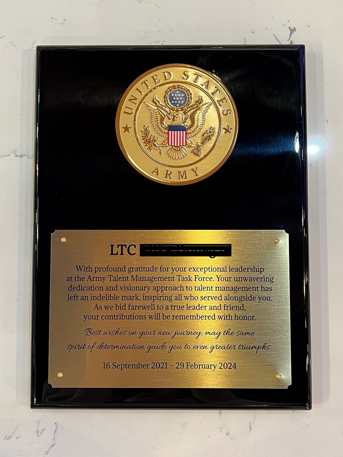 Black shiny plaque 9″x12″ with custom logo for retirement.