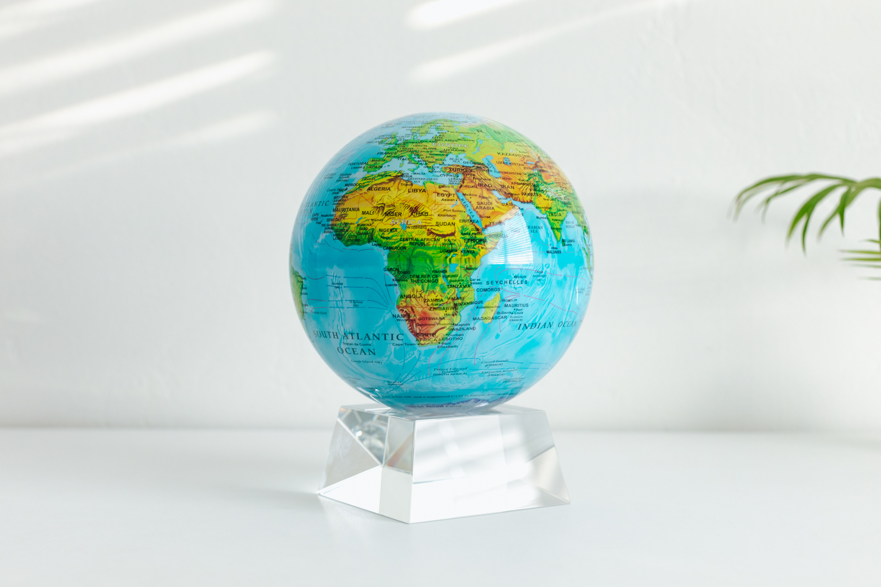 It’s the world globe you remember as a kid, but with a sleek look and updated features that make it a modern decor must-have. Swirls of white and red lines show ocean currents, while each landmass is depicted in green and brown shades that show terrain features – every mountainous region and desert is clearly shown. This level of detail combined with vibrant colors make this MOVA Globe as attractive as it is informative.