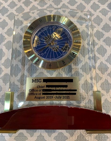 Glass Clock with World Time Dial on Piano Finish Base with Gold Metal Accents. Laser engravable aluminum plate. Individually gift boxed.